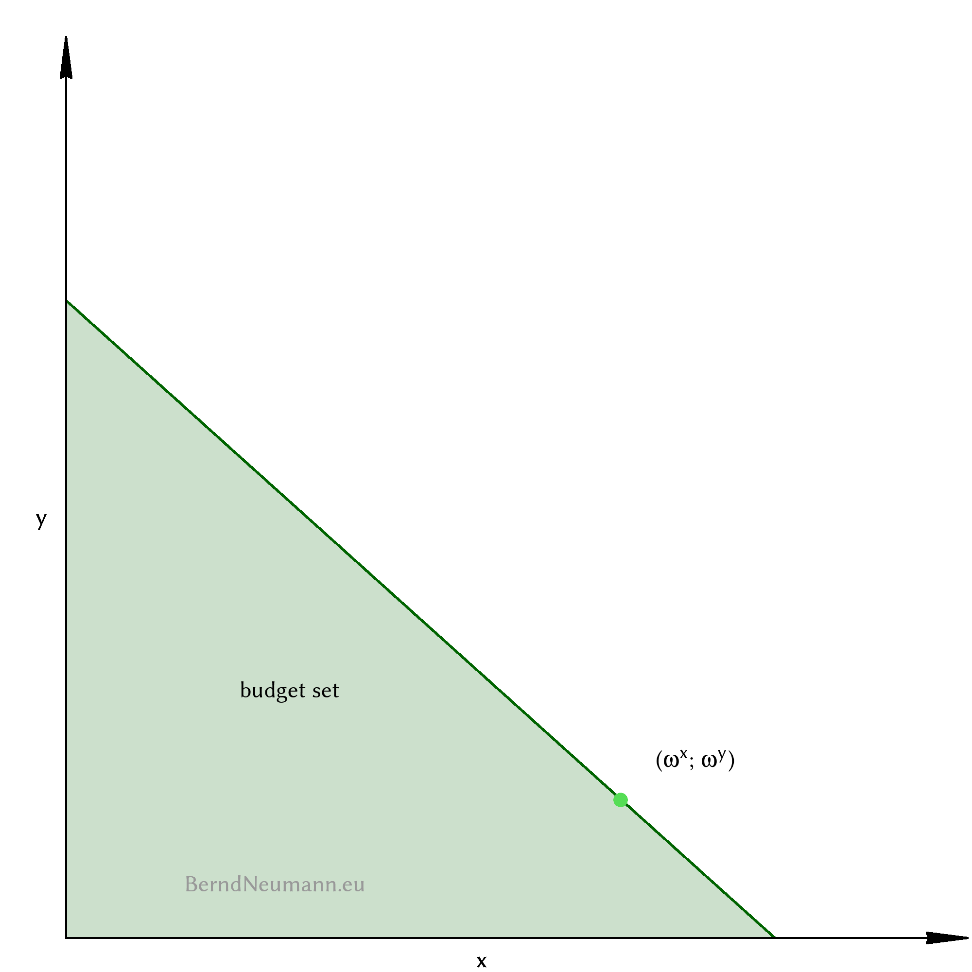 If a bundle of goods \((x; y)\) fulfills the budget constraint, it is part of the budget set or possibility set. We solve the inequality for \(y\) so that we can draw it into the quantity of goods diagram: $$\begin{aligned} y \; &\leq \; -\frac{p_x}{p_y}\,x \; + \; \frac{p_x\,\omega^x \; p_y\,\omega^y}{p_y} \end{aligned}$$