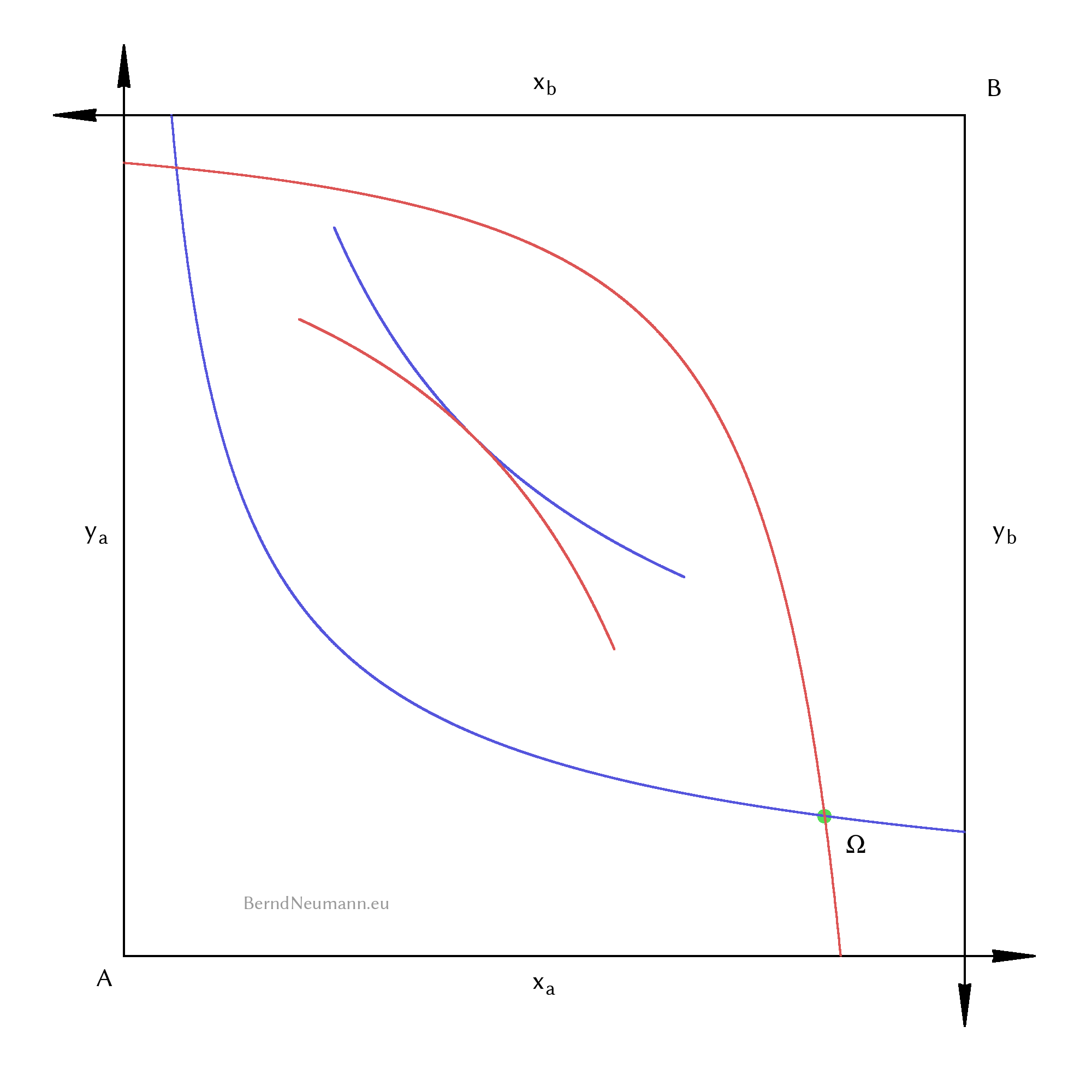 At an allocation further right in the box, individual \(A\) has more of good \(X\); at an allocation further up, more of good \(Y\). Individual \(B\) then has correspondingly less of the respective good. At the point of initial endowment \(\Omega\) individual \(A\) has the bundle \((\omega^x_a; \omega^y_a)\) and individual \(B\) has the bundle \((\omega^x_b; \omega^y_b)\). If one draws the corresponding indifference curves for this allocation, their better sets form a lenticular intersection as common better set. This means that allocations within this intersection are better for both. Thus it is possible to improve the well-being of individuals without having someone lose well-being in return; and it would be inefficient not to do so. In some allocations, there is no such intersection, because there the indifference curves just touch each other. Such an allocation is called a Pareto efficient allocation. There it is no longer possible to make one better off without the other one having to accept a lower utility.