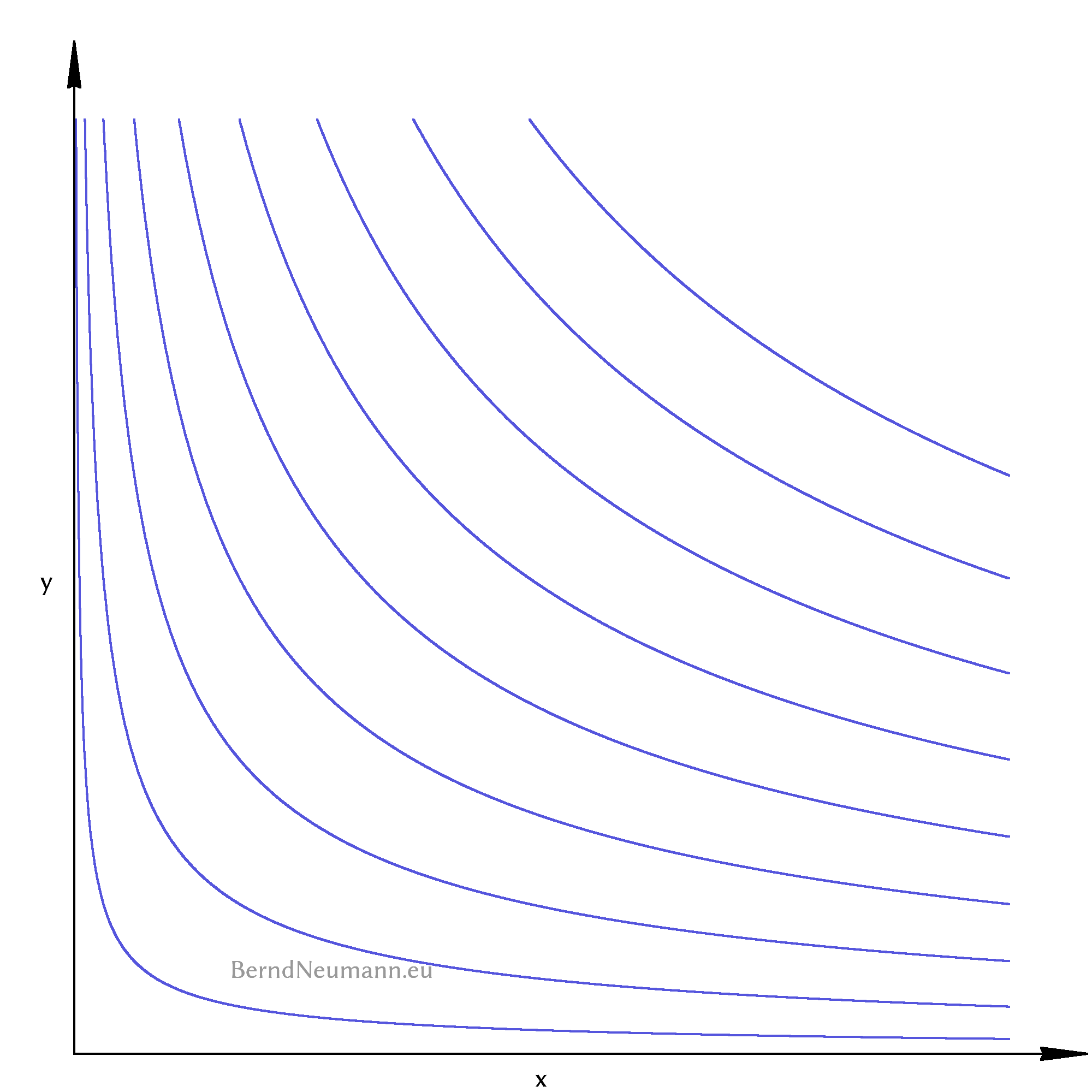 , which increases steadily to the right and upwards. – Since the utility values are unimportant and only a greater or lesser value is important, we only need the contour lines (indifference curves). We can draw them two-dimensionally and only need to know that an indifference curve further to the top right represents bundles of goods with a higher utility level.