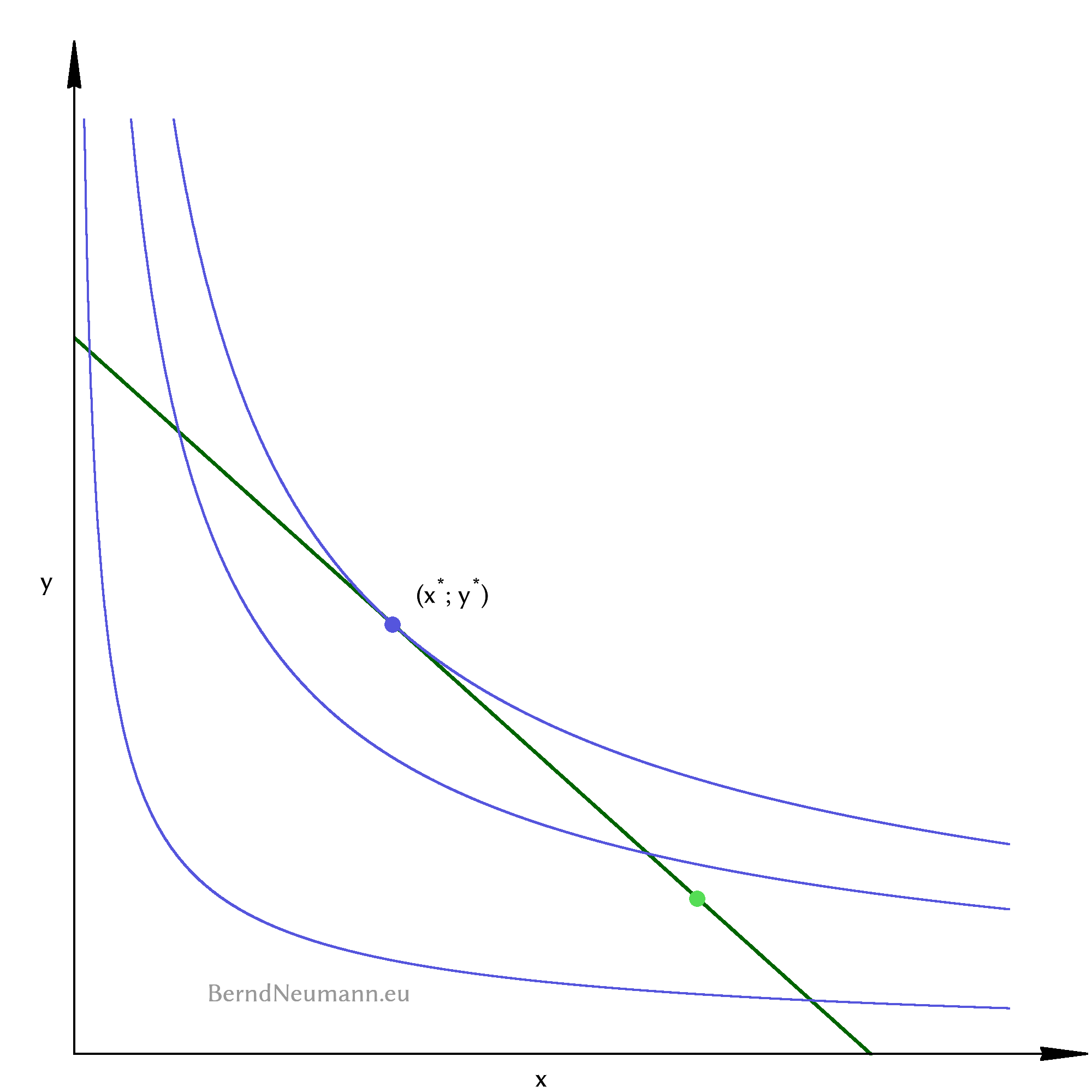 The individual thus consumes the bundle of goods \((x^*; y^*)\) and thus maximizes its utility. It is irrelevant how high this utility value is, because it is only relevant that this bundle of goods is the one with the highest utility value within the budget set. This bundle is described by the Marshallian demand functions, and with them everything essential about the decision of a single individual is said.