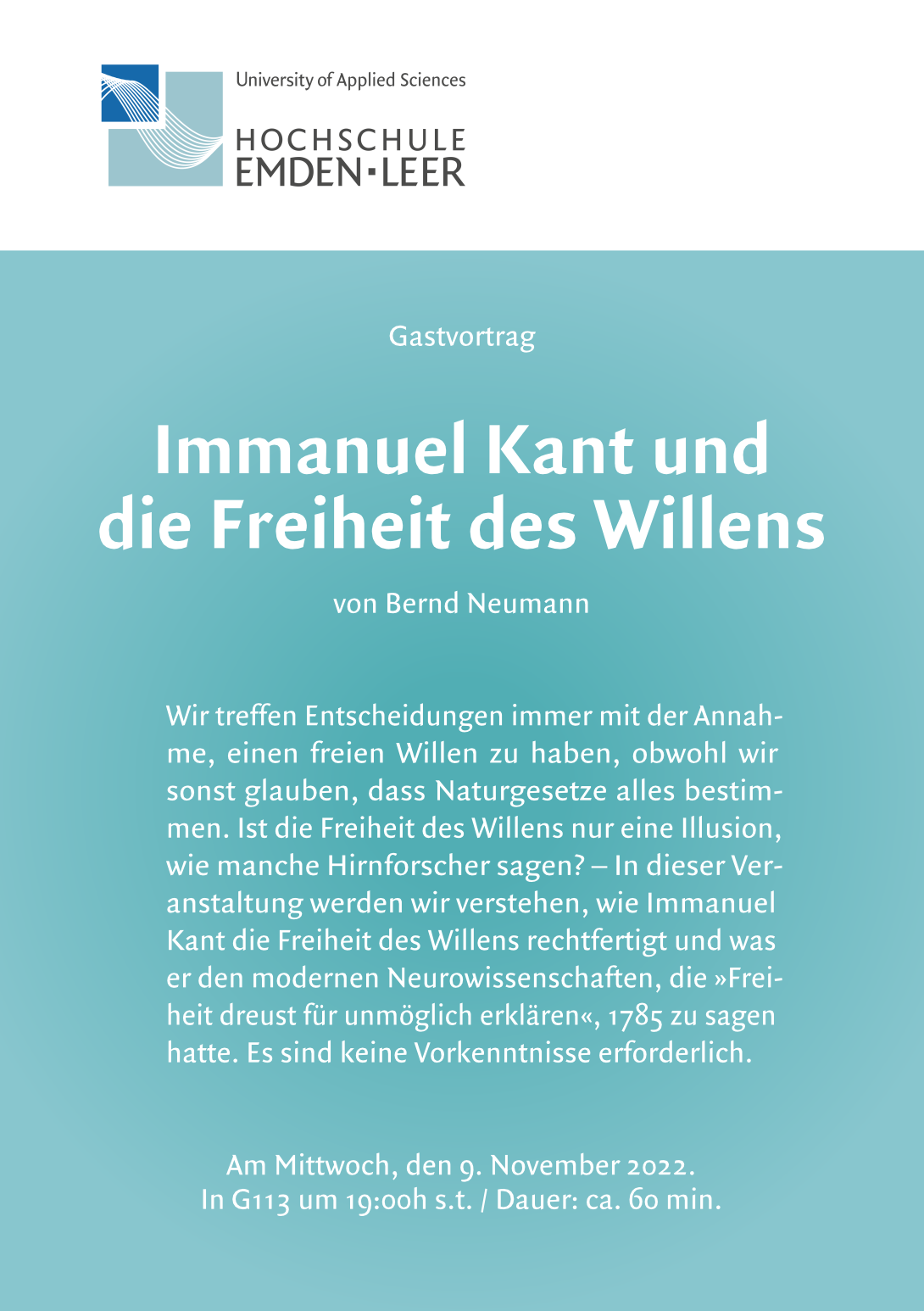 At the University of Applied Sciences Emden I explained in a guest lecture how Immanuel Kant thinks about the freedom of the will and what he has to say to modern neuroscience, which in recent times denies the freedom of the will. Without presupposing any prior knowledge, I will first convey in this lecture the limits of our cognitive faculties according to Kant. Thereby it will become clear why statements about the freedom of the will made by natural sciences must remain at least doubtful. Subsequently, I explain how Kant justifies the freedom of the will despite these limits within the scope of practical philosophy. In order to gain more proximity to Kant's way of thinking, I do not only lecture about Kant, but read concise text excerpts from Kant's works with the audience, which I explain afterwards.